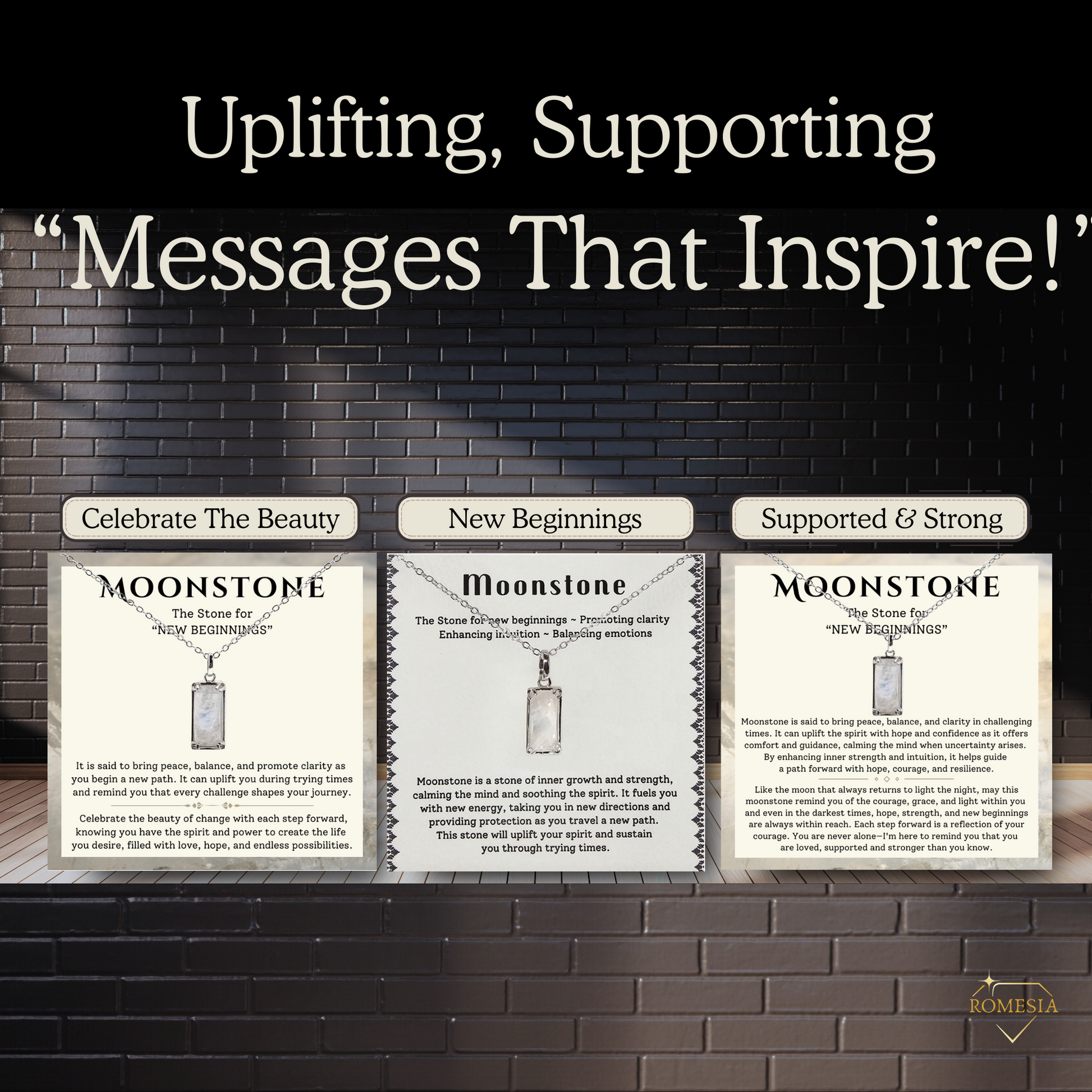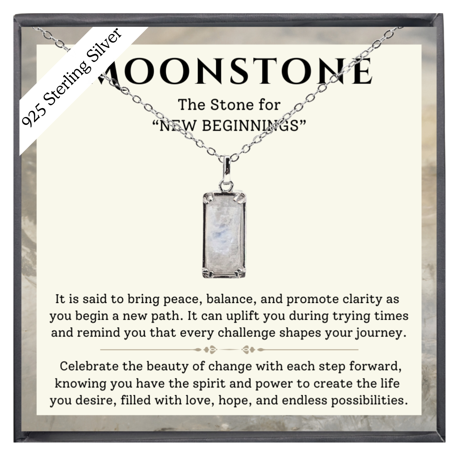 HANDMADE WITH LOVE: Crafted with care, our sterling silver necklaces are a reflection of our commitment to family and to you. Each authentic moonstone is mined in India and expertly hand-cut by skilled gemstone artisans.The pendent itself measures 1/4" in. wide and 1/2"in. tall. The sterling silver pendant chain measures 18” with an adjustable loop at 16” and is stamped with the words "NEW BEGINNINGS" on the back making it a true motivational pendant necklace with meaning and inspiring jewelry for women.