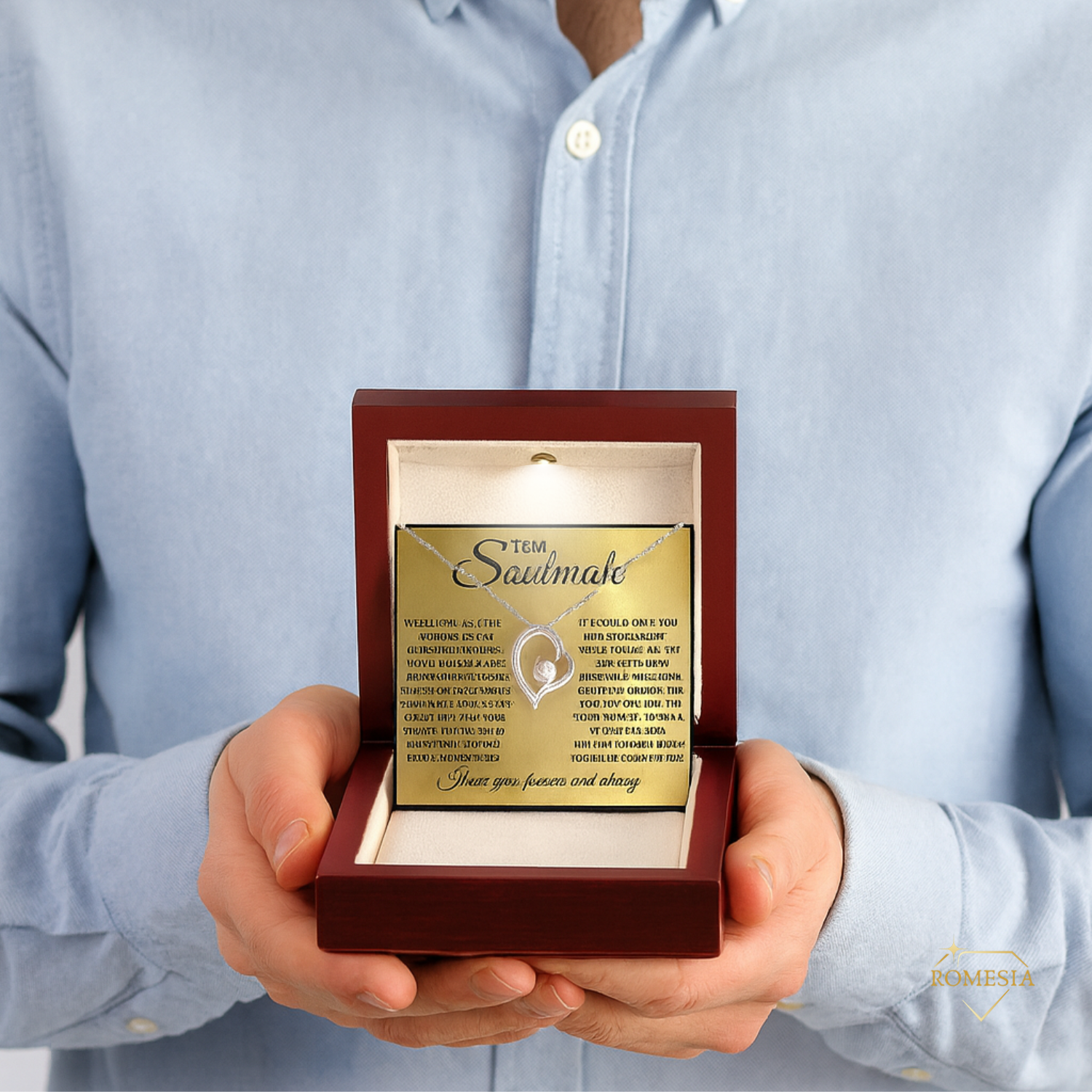 Your piece is lovingly packaged in a complimentary soft touch box for easy gifting. Elevate your presentation by upgrading to the mahogany style luxury box, which features a brilliant LED spotlight.